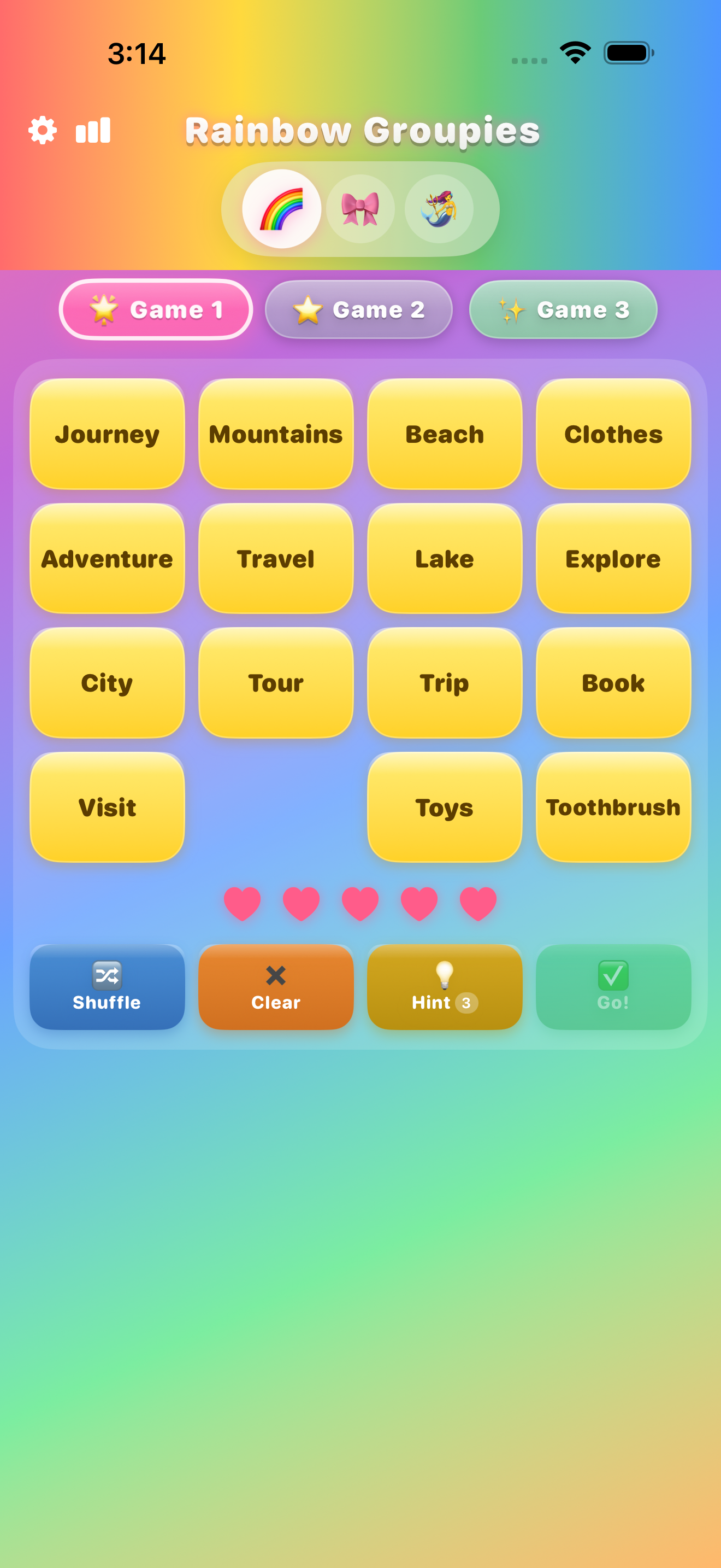 Rainbow Groupies offers 3 brand-new puzzles every single day. New puzzles appear at midnight, so there is always a fresh challenge waiting.